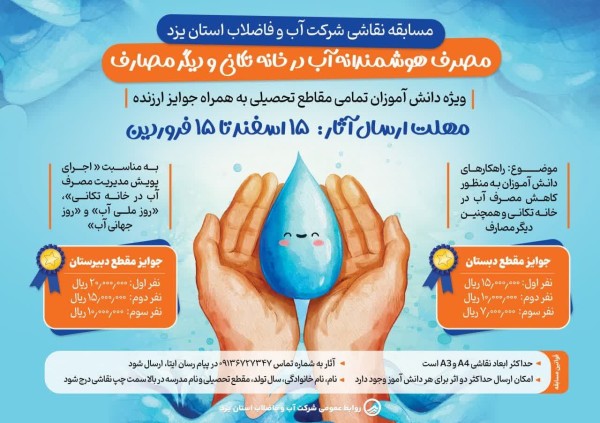 ضیاء زینی مدیر روابط عمومی شرکت آب و فاضلاب استان یزد گفت: این مسابقه به منظور آشنایی هر چه بیشتر کودکان و نوجوانان با روش های صرفه جویی در مصرف آب و فرهنگ سازی و نهادینه نمودن استفاده صحیح آب در بین خانواده ها توسط کودکان به عنوان مروجین مصرف آب برگزار می شود.