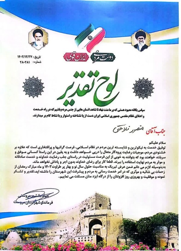 جواد دانشور فرماندار مروست ضمن تبریک سال نو و ماه مبارک رمضان گفت: بر خود لازم می دانم از تلاش های بی وفقه و اقدامات موثر منصور فلاحتی در امر خدمت رسانی به مردم و پیشرفت این شهرستان، قدردانی نمایم.