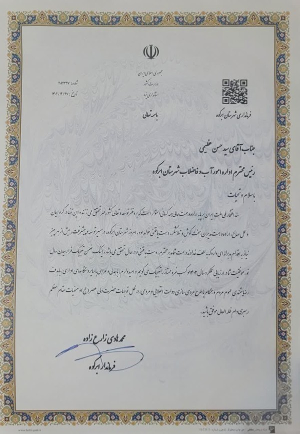 فرماندار ابرکوه از کسب رتبه ممتاز توسط امور آب و فاضلاب شهرستان ابرکوه در ارزیابی عملکرد مدیران این شهرستان در سال 1402 تقدیر کرد.