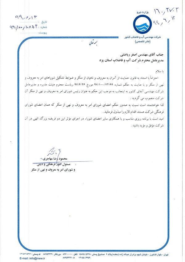 با استناد به قانون حمایت از آمران به معروف و ناهیان از منکر و ضوابط تشکیل شوراهای امر به معروف و نهی از منکر و با عنایت به حکم ریاست محترم هیات مدیره و مدیر عامل شرکت مهندسی آبفای کشور به اینجانب ، به موجب این حکم به عنوان رییس شورای امر به معروف و نهی از منکر آن شرکت منصوب می گردید .